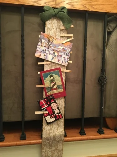 Not enough space for all of those holiday cards? Make this fun card holder in less than 20 minutes. All you need to do is cut lace covered burlap to the length of your choosing, hot glue a burlap bow to the top, add clothes pins to secure the cards and hang with twine.